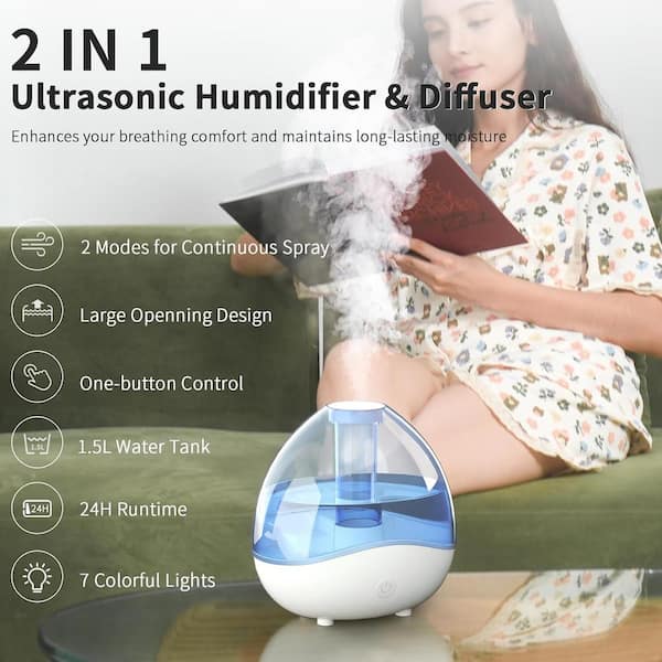 0.4 Gal. Ultrasonic Cool Mist Humidifier with Removable 1.5L Water Tank & Night Light Up To 24 Hours in Blue