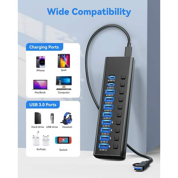 10-Port USB 3.2/USB-C Hub with Individual Switches and 12 V Power Adapter Aluminum Design for Desktop Laptop