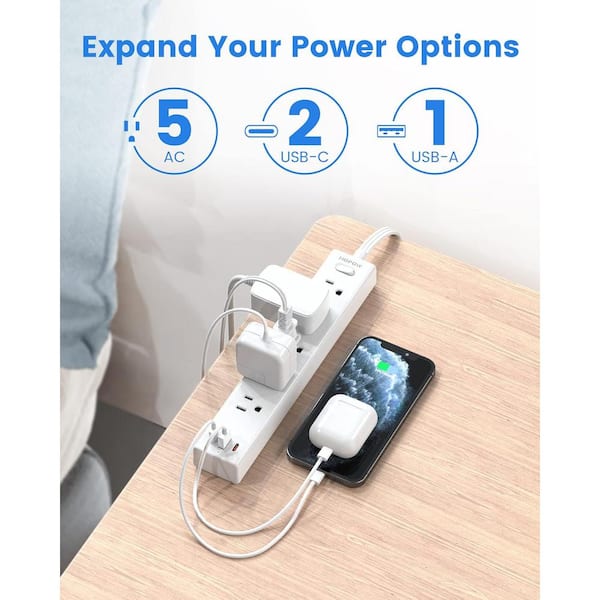 10' Ultra Thin Flat Plug Power Strip Extension Cord, Surge Protector with 5 Outlet, 3-USB Port (2-USB C), 1250W, White