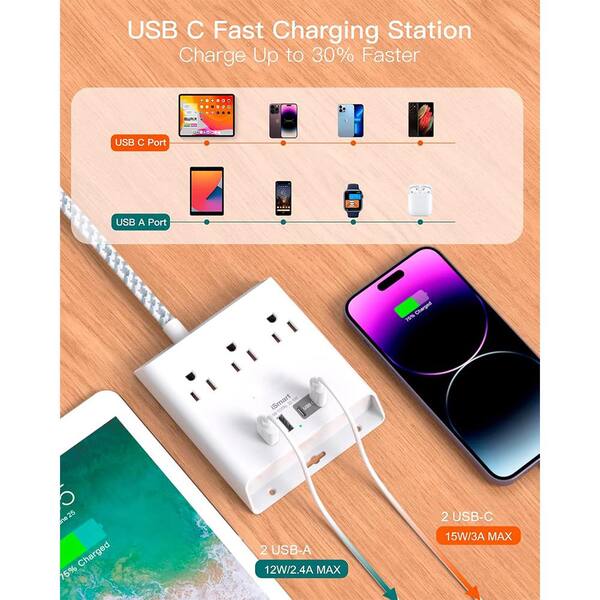 10 ft. Flat Plug Extension Cord Power Strip 3-Outlets No Surge Protection in White with 2 USB and 2 Type C Ports
