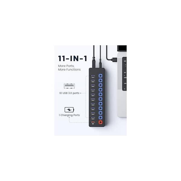 11-Port USB 3.0 Hub Splitter with 10-Data Transfer Ports and 1-Smart Charging Port Switch and LED Indicator for PC/Mac