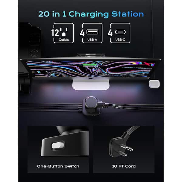 12-Outlet Power Strip Tower Surge Protector with 8-USB Port and 10 ft. Extension Cord - Fast Charging Station in Black