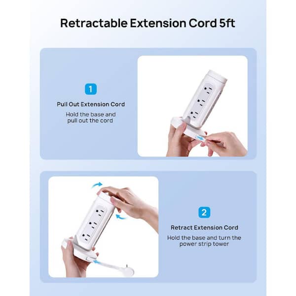12-Outlet Retractable Power Strip Tower Surge Protector with 5 ft. Flat Plug Cord, 4-USB Ports and USB-C PD 20W, White