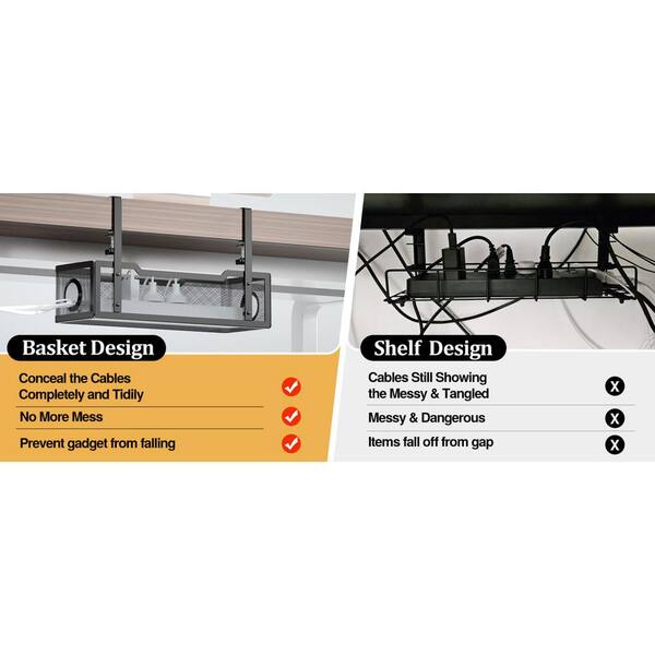 13.4 in. Under Desk Cable Management Box Black Powder-Coated Metal No Drill with Clamp & Anti-Scratch Mats Wire Tray