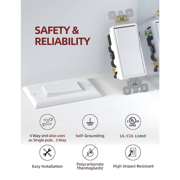 15 Amp 4 Way Decorative Rocker Switch Self Grounding, Wall Plate Included UL Listed, Glossy White 10-Pack
