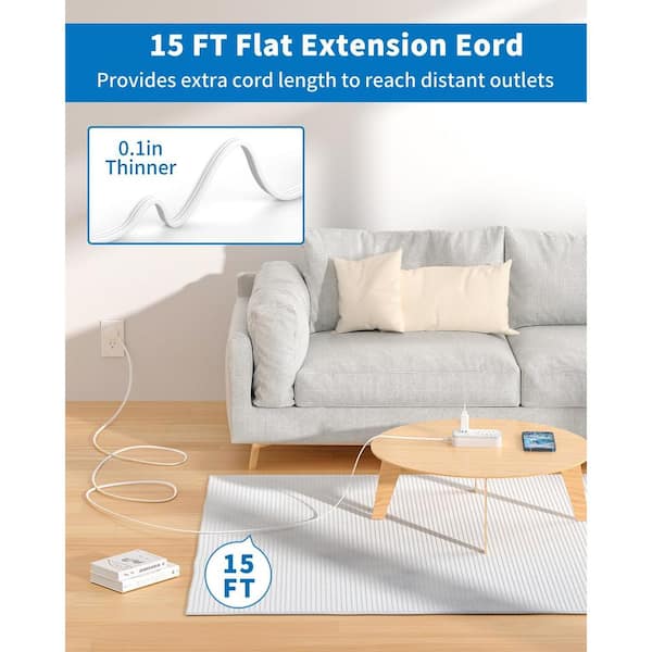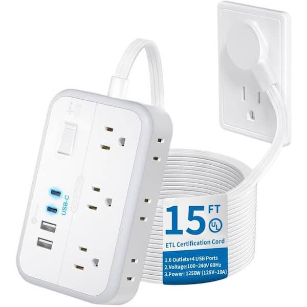 15' Flat Plug Extension Cord, Surge Protector Power Strip with 6 Widely Outlets 4 USB Ports (2 USB-C) and Wall Mounted