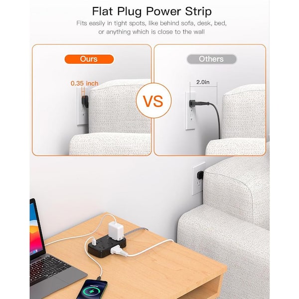 15 ft. Flat Plug Power Strip Extension Cord with 6-Outlets 2 USB-A, 2 USB-C and No Surge Protector, Cruise Ship Approved