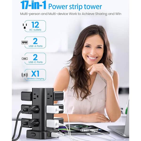 16-Outlet Tower Power Strip Surge Protector 15-Watt Wireless Charger with 6' Flat Plug Extension Cord 4 USB Ports White