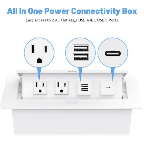 2-Outlets 6 ft. Power Cord Pop Up Power Strip with 2 USB-A and 1 USB-C Charging Ports in White