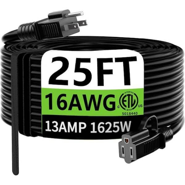 25 ft. 16/3 Heavy Duty Indoor/Outdoor Extension Cord with Tri-Tap and Lighted End, 13A 1625W 16AWG SJTW 3 Prong, Black