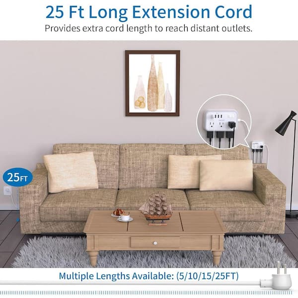 25 ft. Flat Plug Extension Cord with 6 Outlets 4 USB Ports Home Outlet Extender Surge Protector Power Strip for Indoor