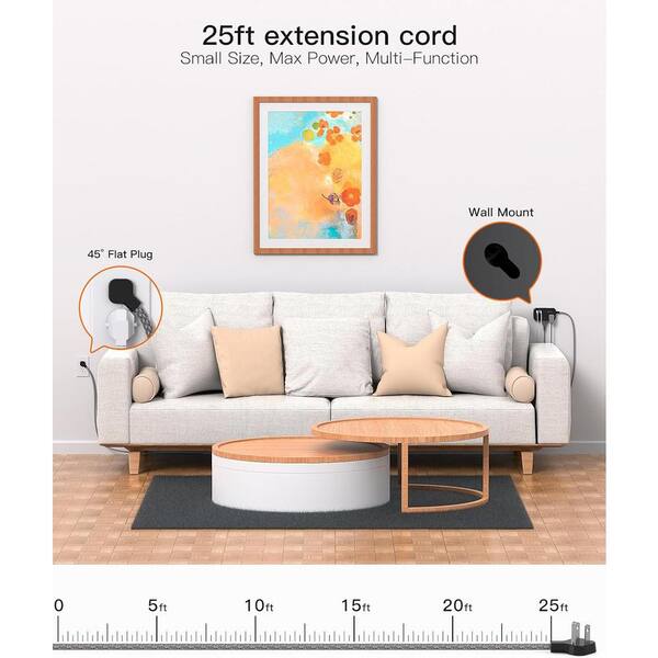 25 ft. Flat Plug Power Strip Extension Cord with 6 Outlets, 4 USB Ports (2 USB-C), No Surge Protector, Wall Mount, Black
