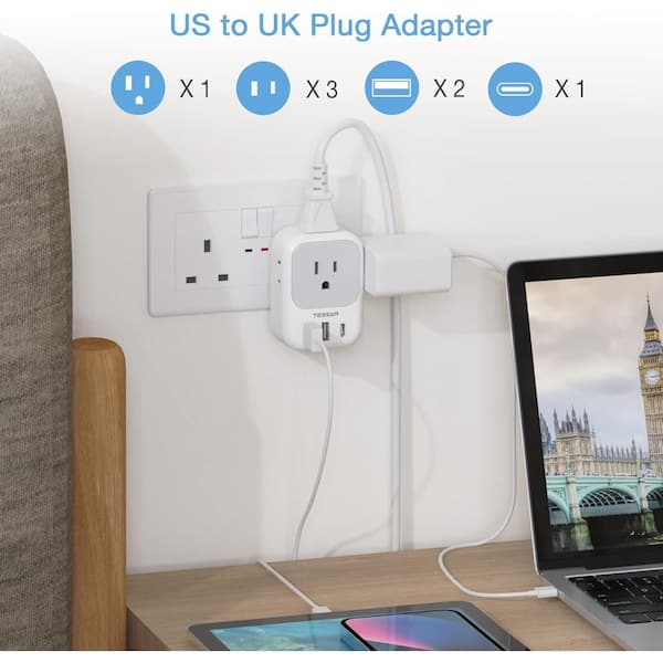 3 Amp AC/DC Adapter Travel US to UK Plug Adapter with USB Port in Gray