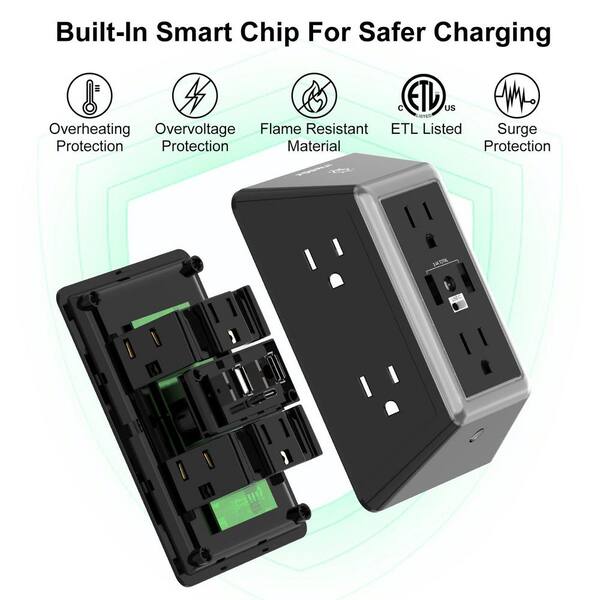 3 Sided 6-Outlet Multi Plug Outlet Surge Protector in Black with 3 USB Ports and Night Light
