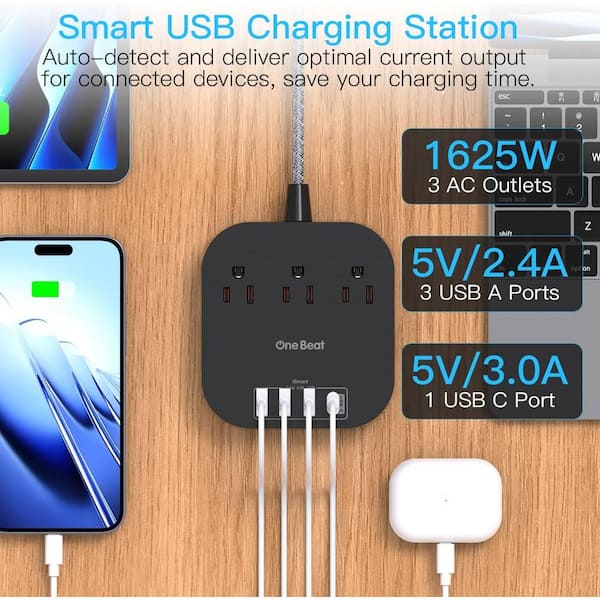 5 ft. Braided Cord Power Strip with Flat Plug, 3-Outlets 4-USB Ports (1 USB-C) Non Surge Protector for Travel in Black