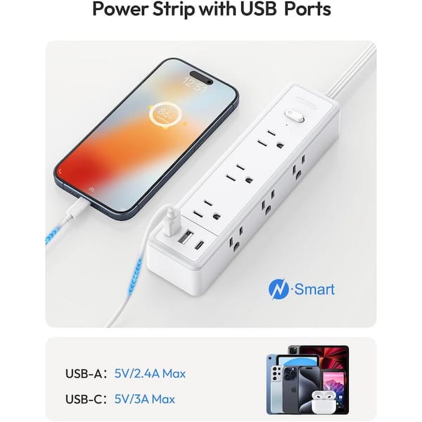 5 ft. Extension Cord Flat Plug Surge Protector Power Strip with 9 Outlets, 2 USB A Ports and 1 USB C Port, White