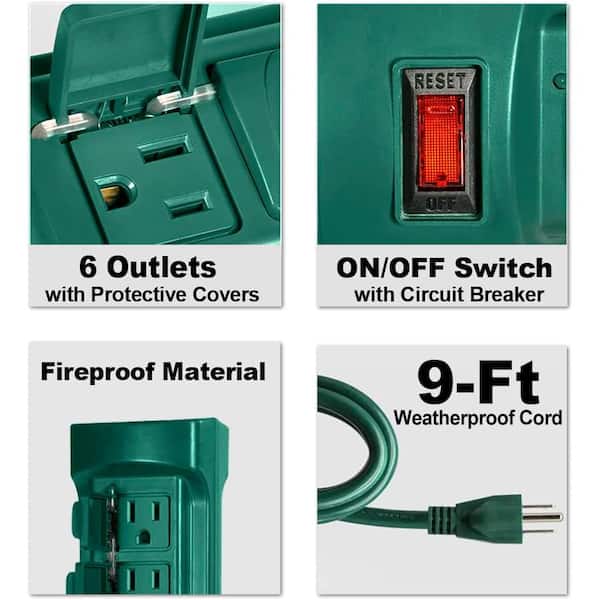 6-Outlet Outdoor Surge Protector Power Strip with Stake, 9 ft. Extension Cord and Weatherproof Covers, Green