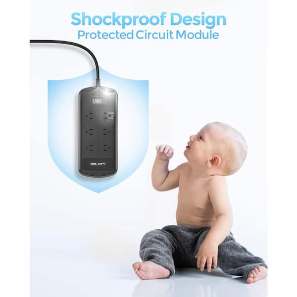 6-Outlet Power Strip Surge Protector with 3 USB Ports, 6 ft. Extension Cord - Shockproof and Weatherproof in Black