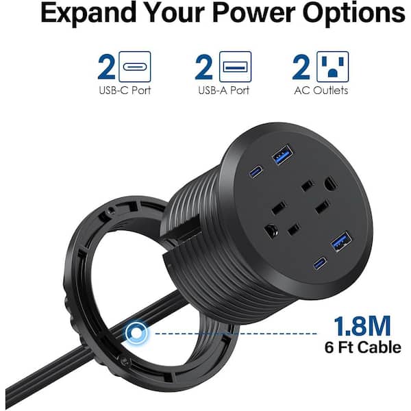 6 ft. 2-Outlet Surge Protector Flush Mount Recessed Outlet with 2 USB-A, 2 USB-C Ports in Black