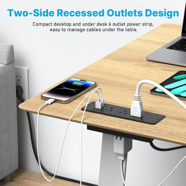 6 ft. Cord 6-Outlets Dual Side Recessed Power Strip Surge Protector in Black with USB Ports, Hidden Charging Station