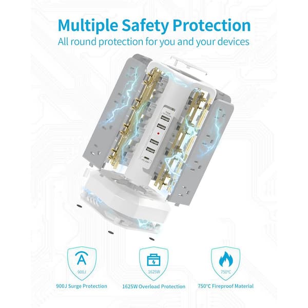 6 ft. Extension Cord 16-Outlet Power Strip Surge Protector Tower in White with 5 USB Ports