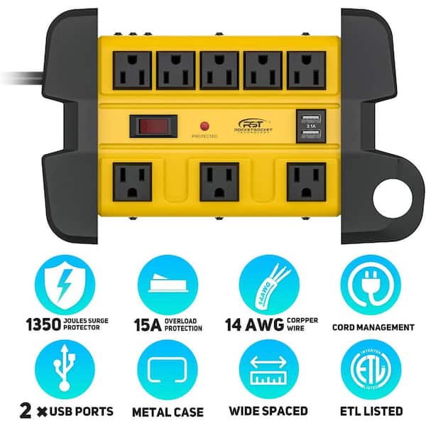 6 ft. Heavy-Duty Metal Industrial Surge Protector Power Strip with 15 Amp Circuit Breaker, 8-Outlets and 2 USB-A Ports