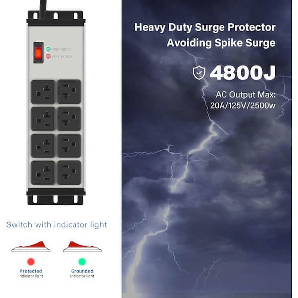 6 ft. Metal Heavy Duty Power Strip Surge Protector 20 AMP with 8-Outlets, Mountable in Gray