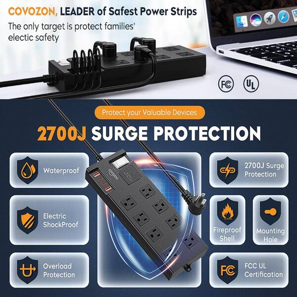 6 ft. Plug Extension Cord Power Strip 8-Outlets Surge Protector in Black with 2 USB and 2 Type C Ports and Power Switch