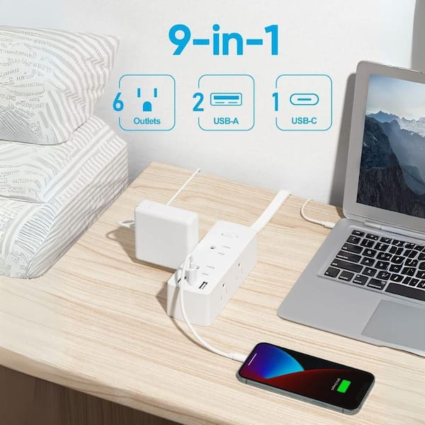 6-outlet Ultra Thin Flat Plug Power Strip Surge Protector 5ft Extension Cord with 3USB-1 USB C in white