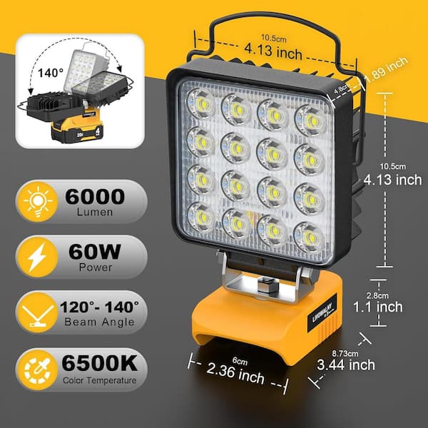 60W 6000 Lumens Cordless LED Work Light for Dewalt 20V Battery with USB and Type-C Charging Port (No Battery)