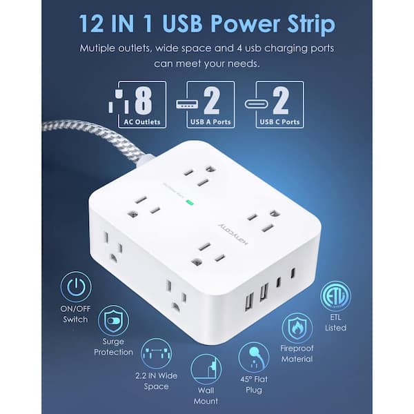 8-Outlet Flat Plug Power Strip Surge Protector in White with 4 USB Ports (2 USB C), 6 ft. Cord