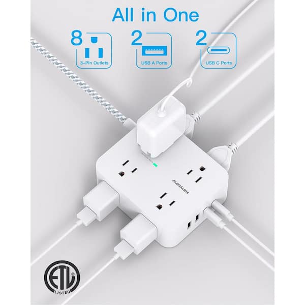8-Outlet Flat Plug Power Strip Surge Protector in White with 4 USB Ports (2 USB C) and 5 ft. Braided Extension Cord