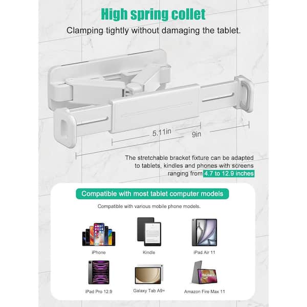 Fully Adjustable Tablet Wall Mount Holder 360° Rotation Fits 4.7-12.9 Devices No Drilling Required White