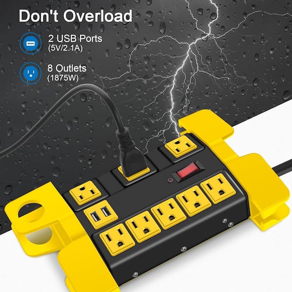 Heavy Duty Green Metal Power Strip with USB 8 Outlet Surge Protector 2700 Joules 6 ft. Cord Workshop Use