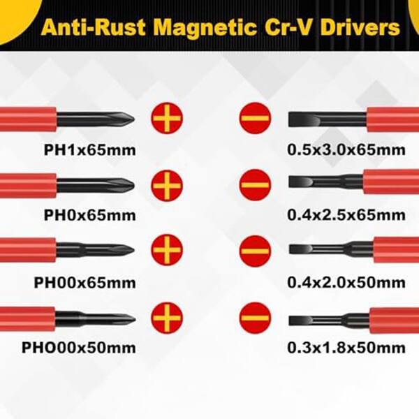 • 8-piece insulated screwdriver set with slotted and Phillips tips