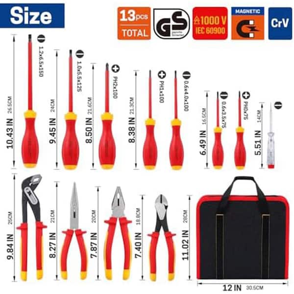 Insulated Electricians Hand Tool Set with 7 Screwdrivers 4 Pliers Voltage Tester Storage Case 12-Piece Red
