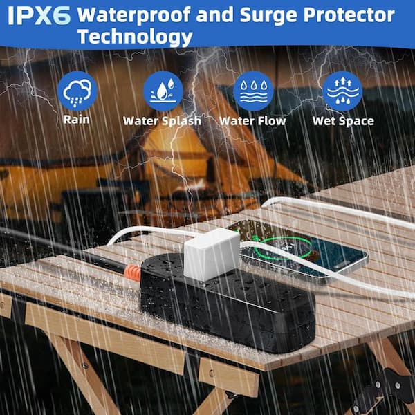 Outdoor Weatherproof Power Strip 10FT Extension Cord IPX6 Waterproof Surge Protector 3 W Outlets Shockproof