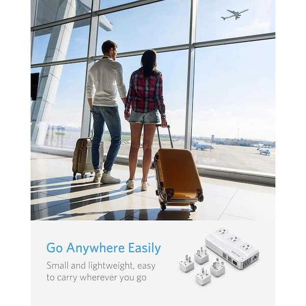 Travel 2-to-3 Prong Adapter EU Plug Voltage Converter 100-220V to 110V with 3-Outlets, 4-USB Ports and 4 Socket in White