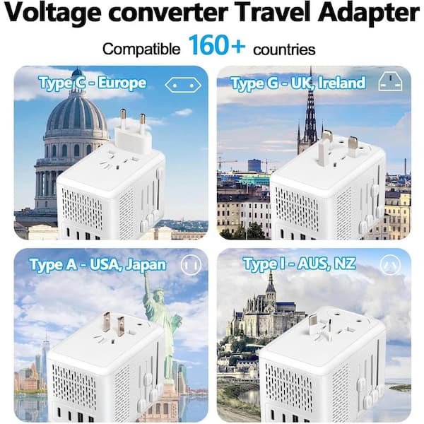 Universal Travel Adapter Voltage Converter Plug 220-Volt to 110-Volt with 1-Outlet and 2 USB-A, 2 USB-C Ports in White