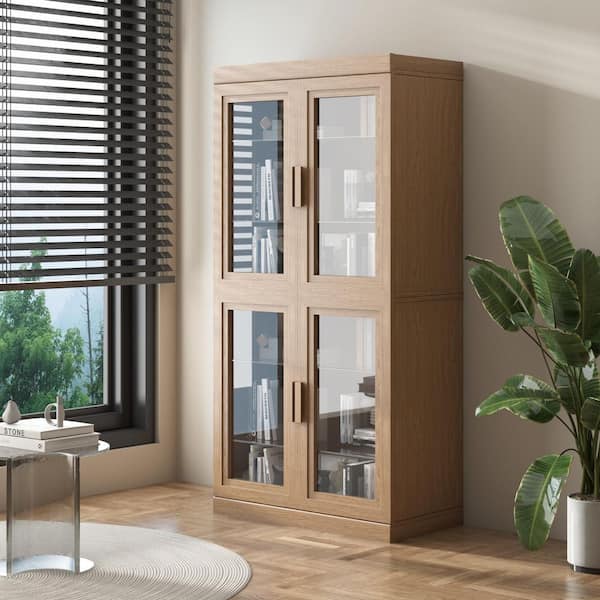 31 in. Tall Natural Wood Grain Wood 2-Shelf Standard Bookcase with Glass Doors, Storage