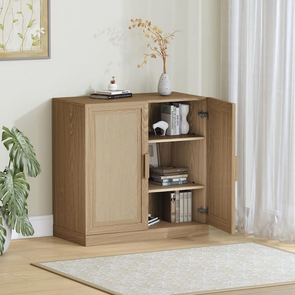 31 in. Tall Natural Wood Grain Wood 2-Shelf Standard Bookcase with Rattan Doors, Storage
