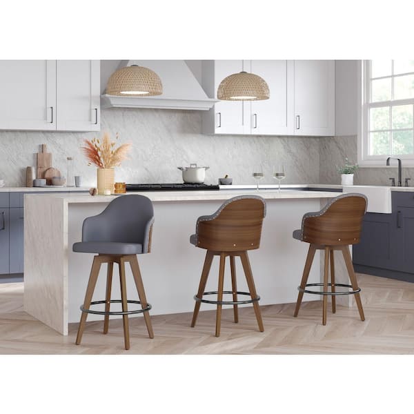 Ahoy 26 in. Walnut and Grey Faux Leather Counter Stool with Nailhead Trim