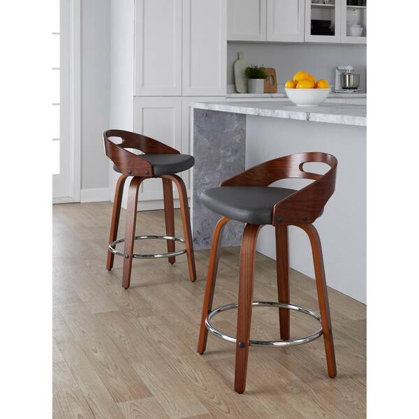 Cassis 24 in. Grey Faux Leather, Walnut Wood and Chrome Metal Fixed-Height Counter Stool (Set of 2)