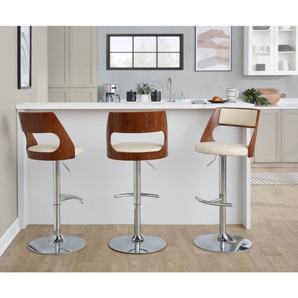 Cecina Chrome Metal, Walnut Wood, and Cream Faux Leather Adjustable Bar Stool with Rounded T Footrest (Set of 2) LYW