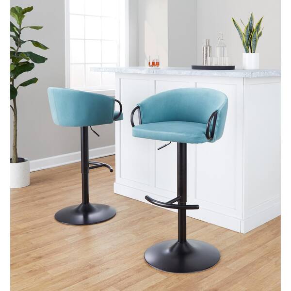 Claire 33 in. Light Blue Velvet and Black Metal Adjustable Bar Stool with Rounded T Footrest (Set of 2)