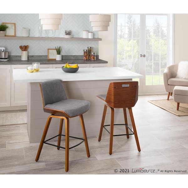 Corazza Mid-Century Modern Walnut Wood and Light Grey Fabric Counter Stool