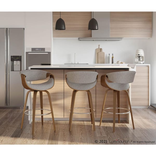 Curvini 40 in. Grey Fabric and Walnut Wood High Back Bar Stool with Round Chrome Footrest (Set of 2)