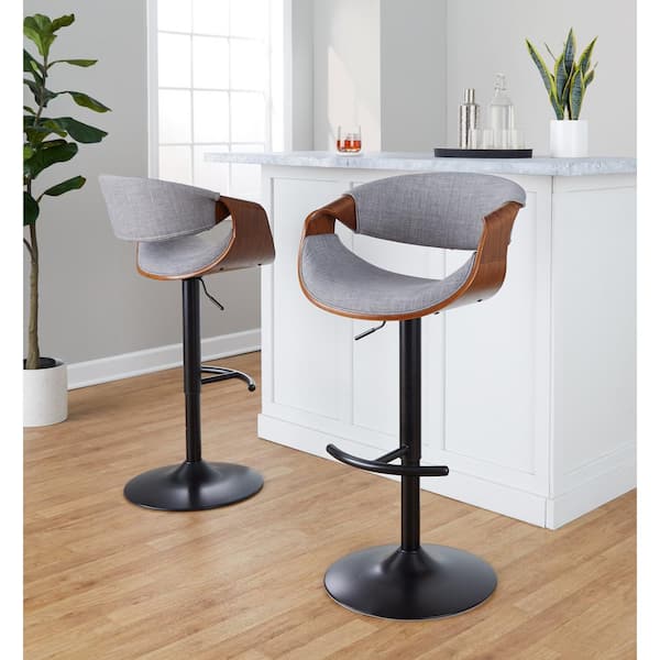 Curvo 33.5 in. Light Grey Fabric, Walnut Wood and Black Metal Adjustable Bar Stool with Rounded T Footrest (Set of 2)