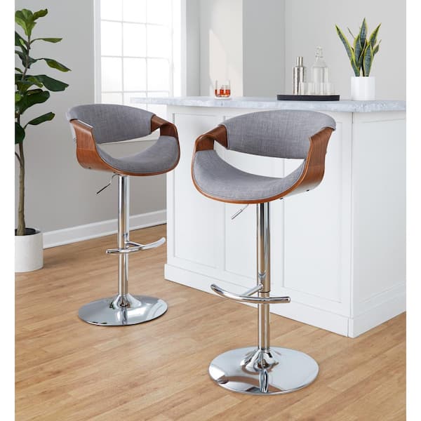Curvo 33.5 in. Light Grey Fabric, Walnut Wood and Chrome Metal Adjustable Bar Stool with Rounded T Footrest (Set of 2)