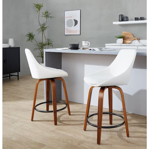 Diana 24.75 in. White Faux Leather, Walnut Wood, and Black Metal Fixed-Height Counter Stool (Set of 2)